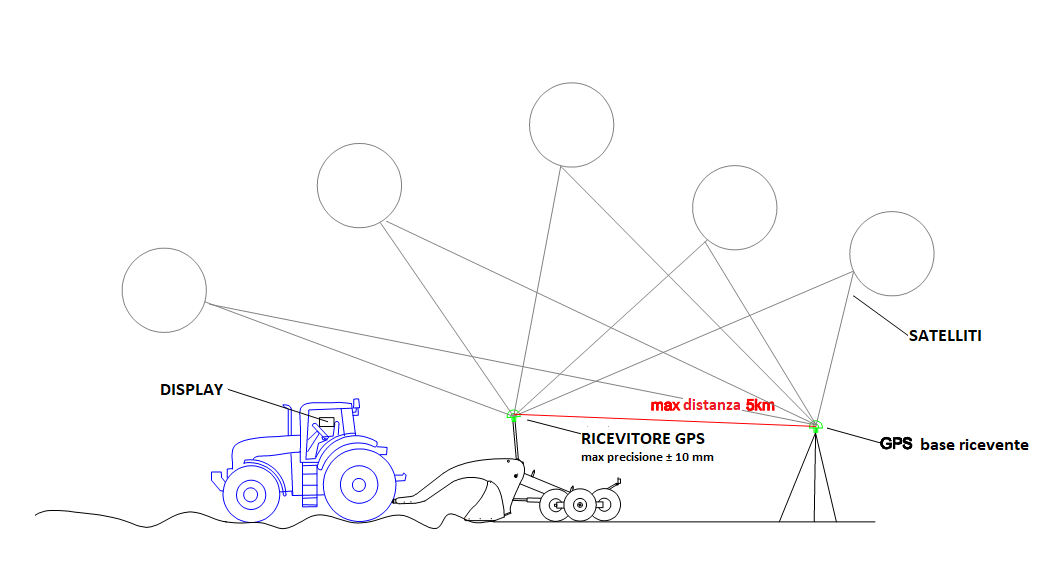 Il sistema GPS è dotato di un ricevitore (base mobile) posto sulla livellatrice che corre sul campo e di un ricevitore fisso (base statica) di riferimento in differenziale, ovvero che definisce la differenza di spostamento tra la stazione mobile e quella fissa. Nella cabina, a fianco dell’operatore, è posizionato uno schermo (pc embedded – pc industriale) che elabora i dati trasmessi dal ricevitore mobile (via cavo) e dal ricevitore fisso (via radio) e manda un comando elettroidraulico che controlla l’altezza della lama, consentendole di eseguire il piano sul terreno. Questo permette di avere precisioni di posizionamento orizzontali e verticali intorno al centimetro, alla distanza massima di 5 km tra i due ricevitori. Più la distanza tra i due ricevitori aumenti, oltre i 5 km, minore sarà la precisione.