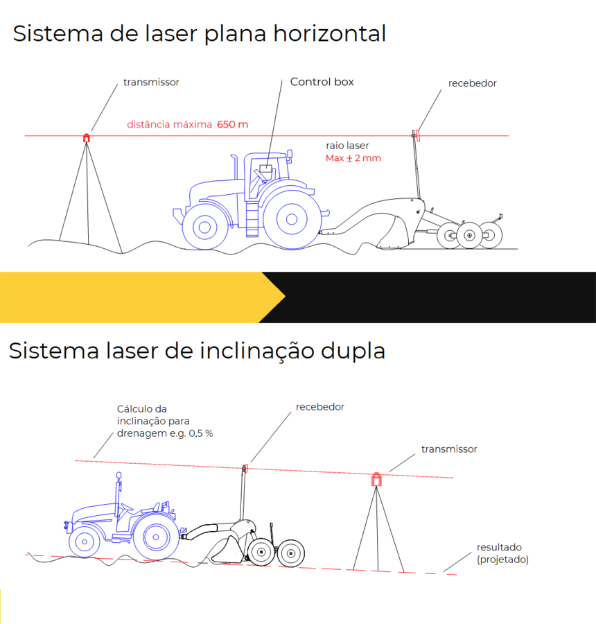 Através do plano criado pelo transmissor de laser e captado pelo receptor, a máquina pode ser adequadamente controlada para o nivelamento do terreno. A geometria particular do projeto e os pistões hidráulicos comandados pelas eletroválvulas, que são controlados pela caixa de controle, garantem que a lâmina se levante e se abaixe de modo correto para obter o plano desejado com uma precisão de ± 2 mm.